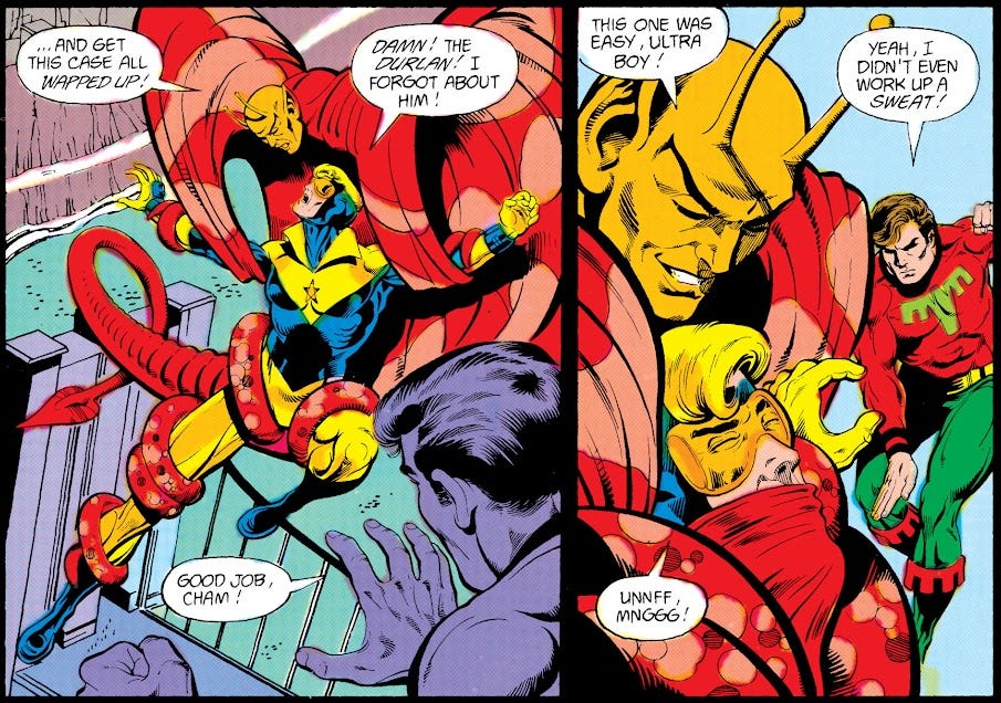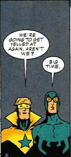 It starts more silly, but it gets more serious after Dan Jurgens takes over (and the writing’s not quite as solid, though it’s definitely not bad). There’s the death of Superman arc, where Doomsday wrecks the team, a period of very cringe 90s writing/art, the Overmaster arc where Booster gets fucked up bad, which then leads into–